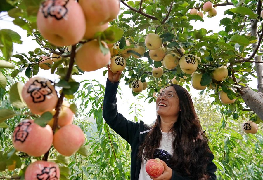 A tourist picks apples at an orchard during the National Day holiday in Xixinzhuang Village of Yanggezhuang Township in Qian'an City, north China's Hebei Province, Oct. 6, 2019. (Xinhua/Yang Shiyao)