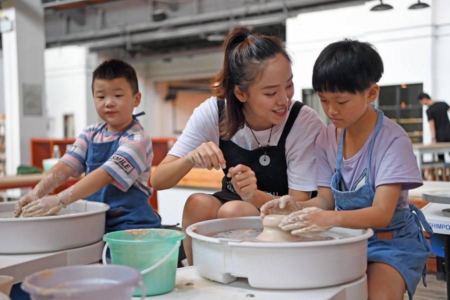 Children learn to make ceramic pieces in Taoxichuan, a cultural and art complex in Jingdezhen, east China's Jiangxi Province, July 26, 2019. (Xinhua/Wan Xiang)