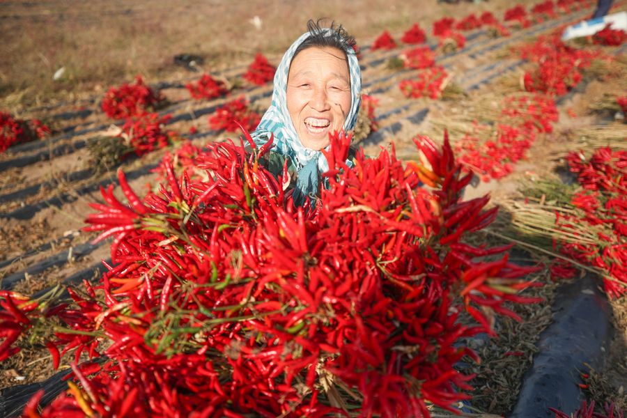 A farmer shows harvested chili peppers in Changgangzi Village of Xiushuihezi Township, Faku County, northeast China's Liaoning Province, Oct. 9, 2019. (Xinhua/Long Lei)