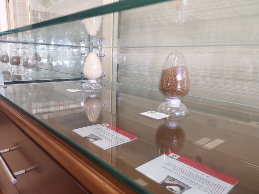 Fish feed products are displayed at the office of the New Hope Egypt Aquatic Technology Co. on Oct. 18, 2019. (Xinhua/Wu Danni)