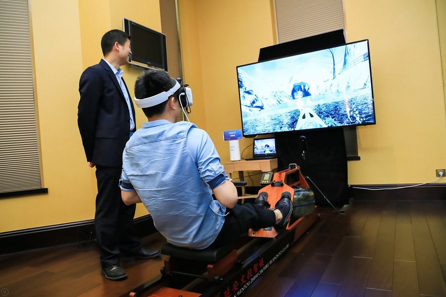 A man experiences a 5G Cloud VR rowing machine developed by Huawei in Shenzhen, south China's Guangdong Province, April 16, 2019. (Xinhua)