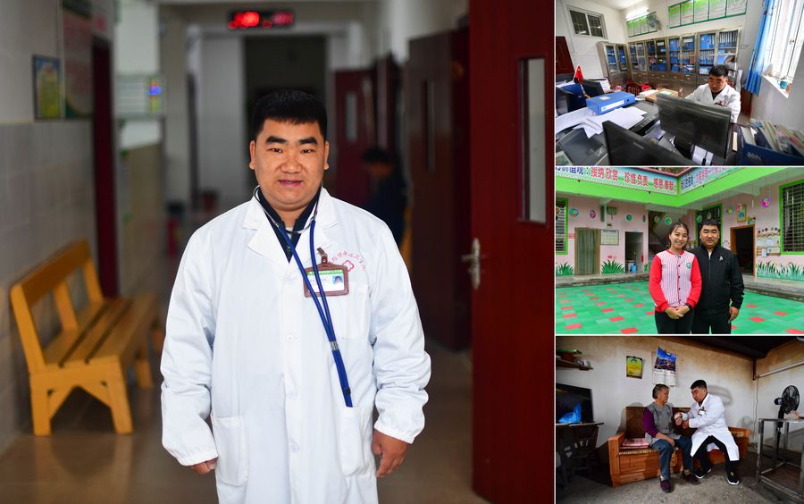 Combo photo shows 29-year-old rural doctor Yang Zhixian posing for a picture (main image in the layout); and Yang's work and life (smaller images in the right-side column), in Banlan Township, Rong'an County, south China's Guangxi Zhuang Autonomous Region, Oct. 23, 2019. Yang has been working in Banlan Township for seven years. His girlfriend, Yang Meiliu, joined him to work as a kindergarten teacher after graduation from college this year. (Xinhua/Huang Xiaobang)