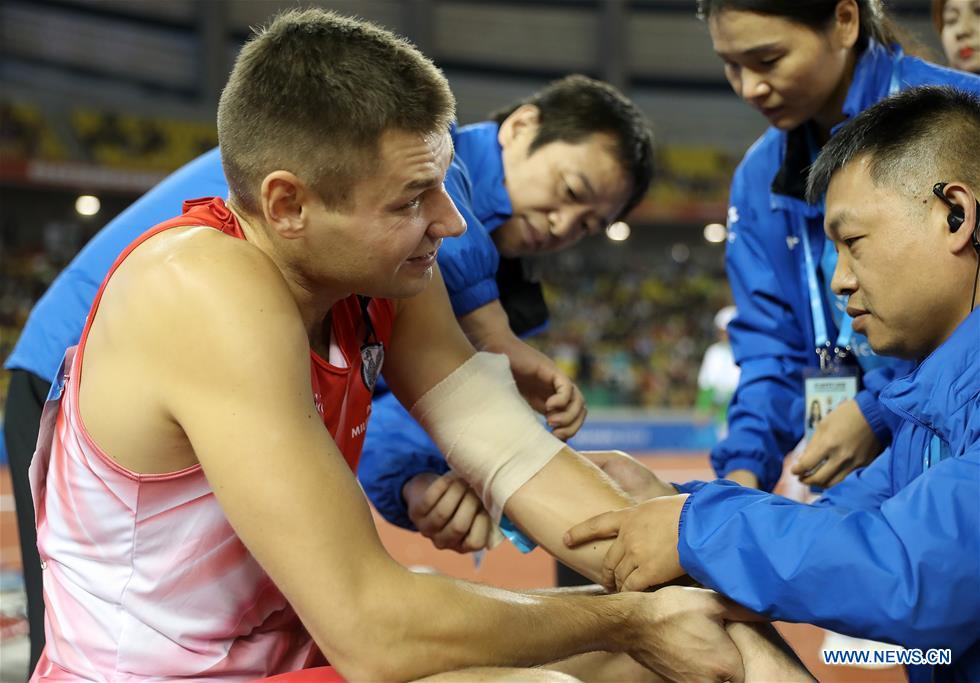 Pawel Wojciechowski of Poland receives medical treatment after he got injured due to his broken pole during the men's pole vault final of track and field at the 7th CISM Military World Games in Wuhan, capital of central China's Hubei Province, Oct. 24, 2019. (Xinhua/Wang Lili)