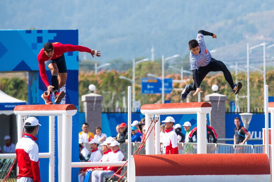 Cheng Fengxuan (R) of China and Laureiro Luis Enrique Manrique of Spain compete during the men's individual obstacle race of naval pentathlon at the 7th CISM Military World Games in Wuhan, capital of central China's Hubei Province, Oct. 23, 2019. (Xinhua/Liu Jinhai)
