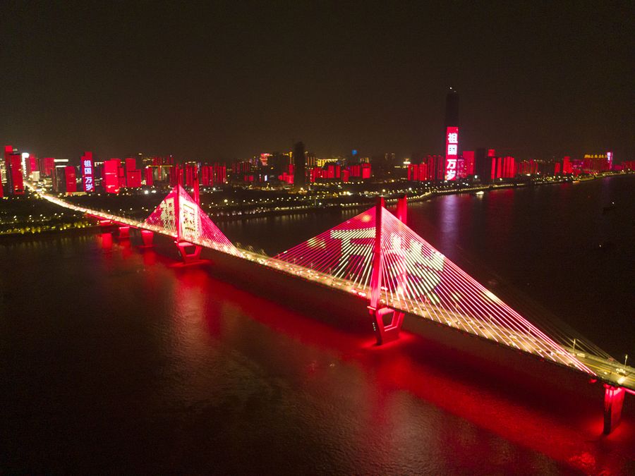 Photo taken on Sept. 30, 2019 shows the light show in Wuhan, capital of central China's Hubei Province. (Xinhua/Xiong Qi)
