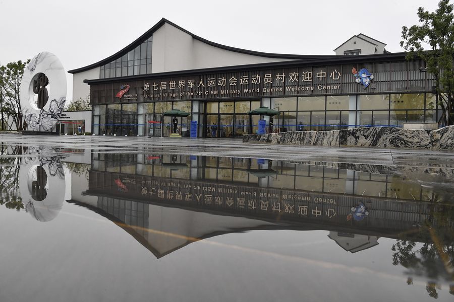 Photo taken on Oct. 16, 2019 shows a view of the welcome center at the athletes' village of the 7th CISM Military World Games in Wuhan, capital of central China's Hubei Province. (Xinhua/Wang Peng)