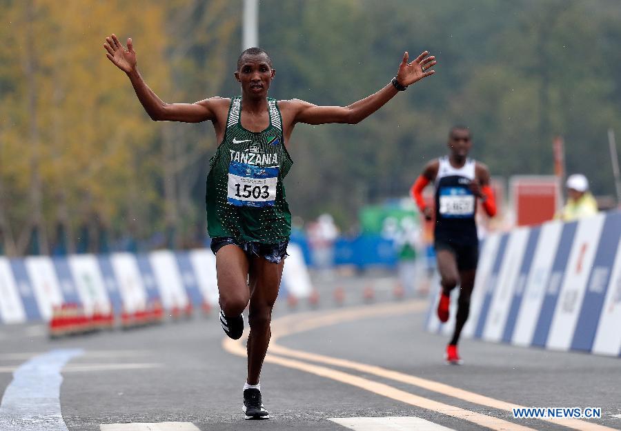 Alphonce Simbu of Tanzania sprints during the men's marathon individual final of track and field at the 7th CISM Military World Games in Wuhan, capital of central China's Hubei Province, Oct. 27, 2019. (Xinhua/Wang Lili)
