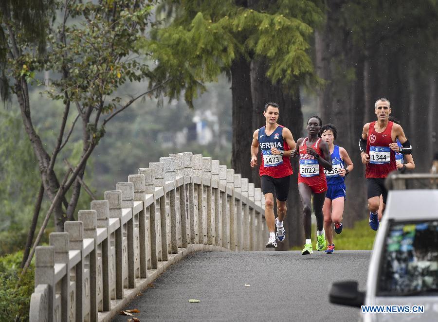 Eunice Chumba (2nd L) of Bahrain competes during the women's marathon individual final of track and field at the 7th CISM Military World Games in Wuhan, capital of central China's Hubei Province, Oct. 27, 2019. (Xinhua/Hu Huhu)