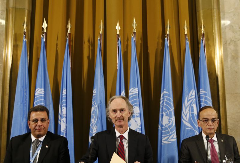 UN Special Envoy for Syria Geir Pedersen (C), Syrian Constitutional Committee's Co-Chairs, Ahmad Kuzbari (L) from the Government, and Hadi Albahra (R) from the Opposition, attend the opening ceremony of the committee in Geneva, Switzerland, on Oct. 30, 2019. The Syrian Constitutional Committee made up of opposition, civil society and government delegations -- each with 50 members -- began its work here as scheduled on Wednesday. (Denis Balibouse/Pool via Xinhua)