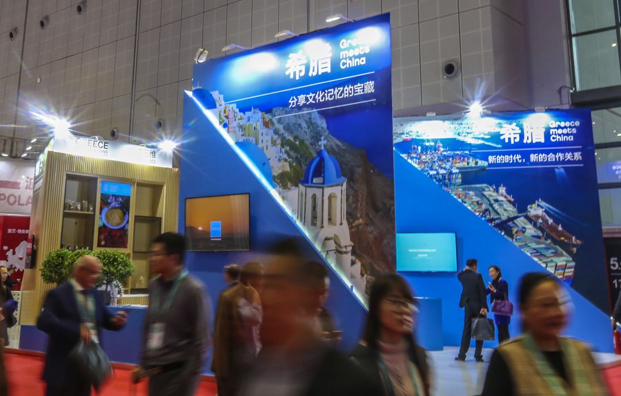 The booth of Greece is seen at the first China International Import Expo (CIIE) in Shanghai, east China, Nov. 6, 2018. (Xinhua/Yin Gang)