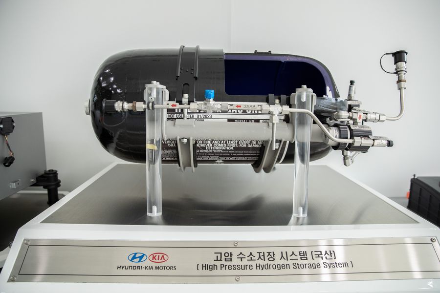 Photo taken on Oct. 22, 2019 shows a high pressure hydrogen storage system at the Eco-Technology Research Institute of Hyundai-Kia Motors in Yongin, South Korea. (Xinhua/Wang Jingqiang)