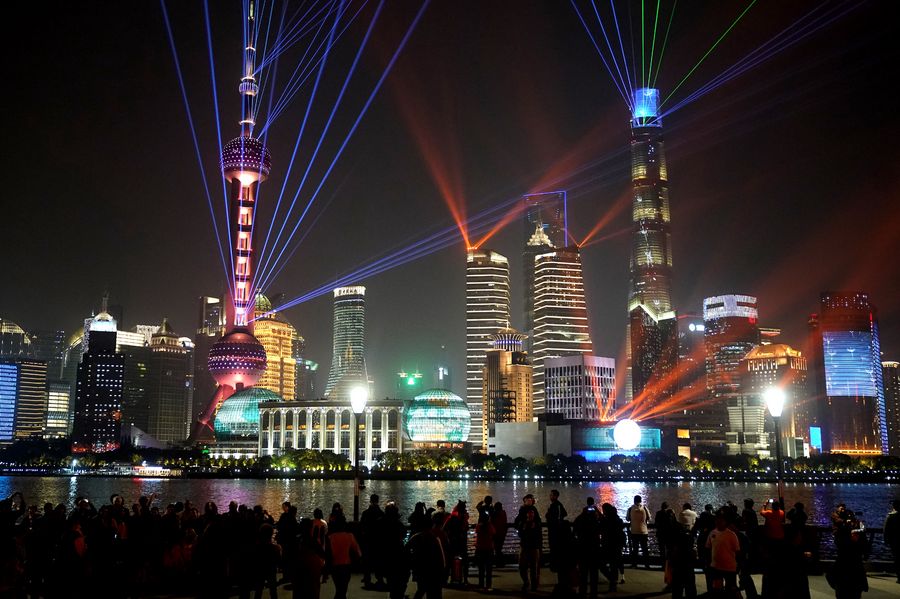 A light show is seen along the Huangpu River in Shanghai, east China, Sept. 18, 2019. (Xinhua/Ren Long)
