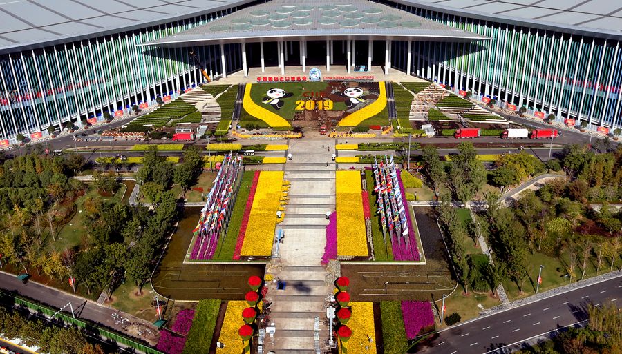 Aerial photo taken on Nov. 1, 2019 shows the south square of the National Exhibition and Convention Center (Shanghai), the main venue for the second China International Import Expo (CIIE), in Shanghai, east China. (Xinhua/Fan Jun)
