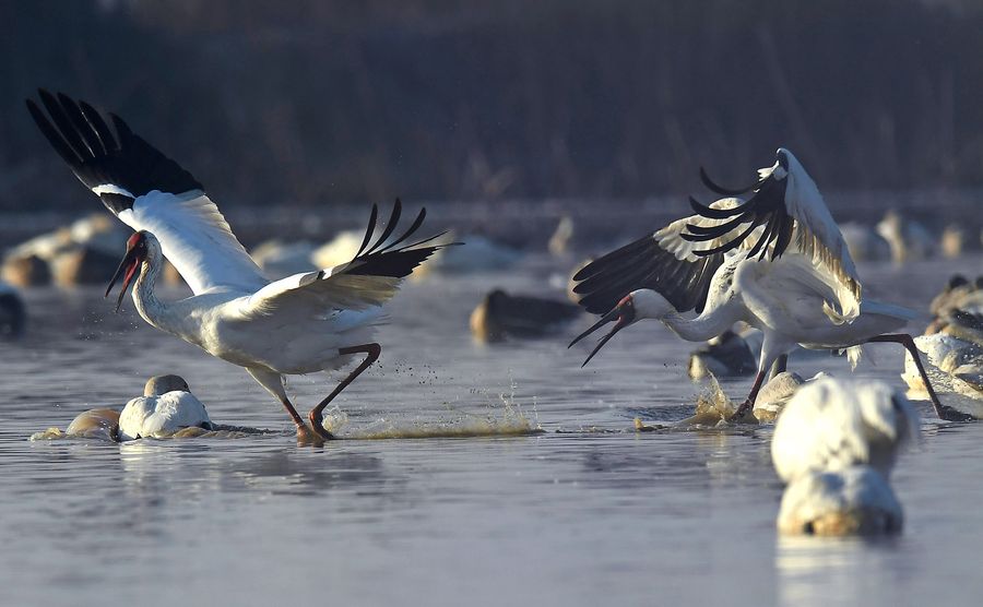 White cranes are seen at the Poyang Lake in east China's Jiangxi Province, Jan. 11, 2018. Poyang Lake is Asia's largest wintering habitat for migratory birds. Hundreds of thousands of birds winter here every year. (Xinhua/Wan Xiang)
