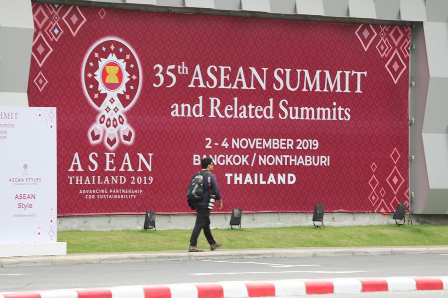 A man passes by a poster of the 35th ASEAN summit and related summits in Bangkok, Thailand, Nov. 1, 2019.(Xinhua/Zhang Keren)