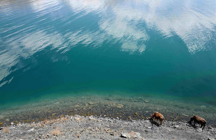 Cows drink water by the Yamzbog Yumco Lake in Nagarze County of Shannan, southwest China's Tibet Autonomous Region, May 29, 2019. (Xinhua/Purbu Zhaxi)