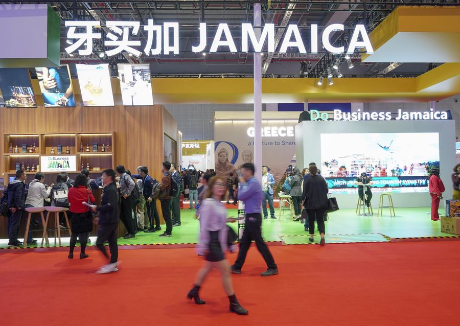 Visitors walk past the Jamaica pavilion during the second China International Import Expo (CIIE) in Shanghai, east China, Nov. 6, 2019. Jamaica is one of the 15 guest countries of honor of the second CIIE. (Xinhua/Yin Gang)