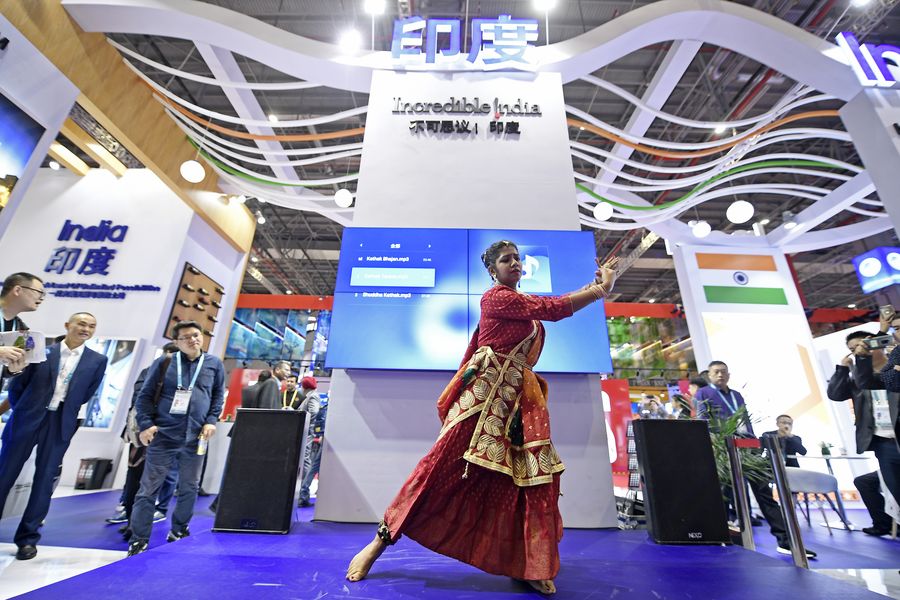 An actress performs at the India pavilion during the second China International Import Expo (CIIE) in Shanghai, east China, Nov. 6, 2019. India is one of the 15 guest countries of honor of the second CIIE. (Xinhua/Wang Peng)