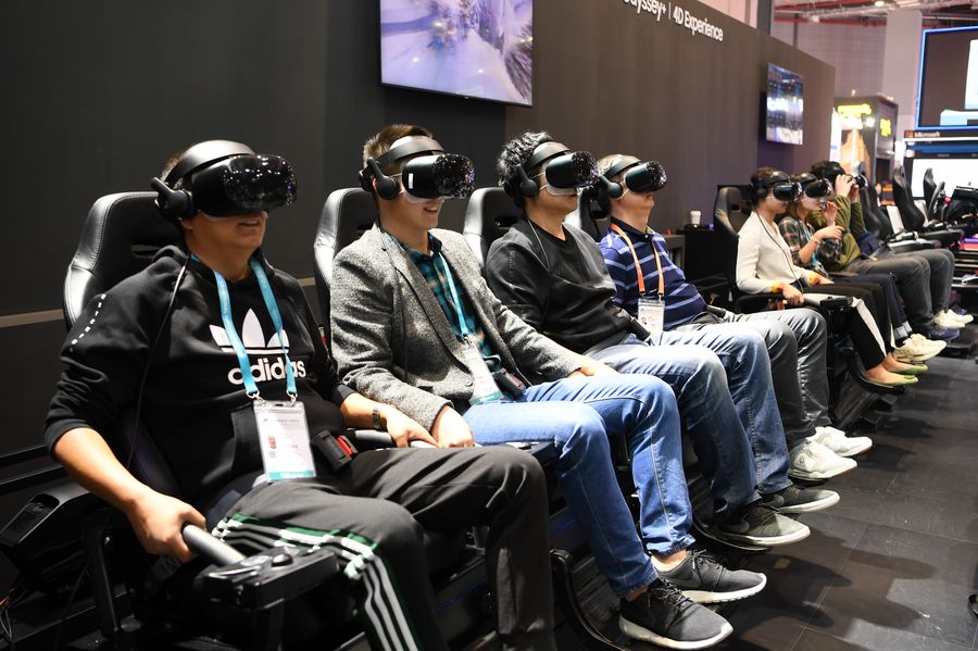 People experience Samsung's VR skiing simulators at the Sci-tech Life exhibition area during the second China International Import Expo (CIIE) in Shanghai, east China. (Xinhua/Fan Peishen)