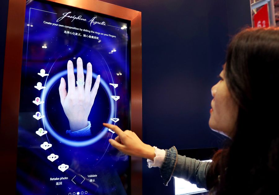 A visitor watches 3D simulations of trying on different rings after having her hand scanned at a jewelry booth during the second China International Import Expo (CIIE) in Shanghai, east China. (Xinhua/Liu Ying)■