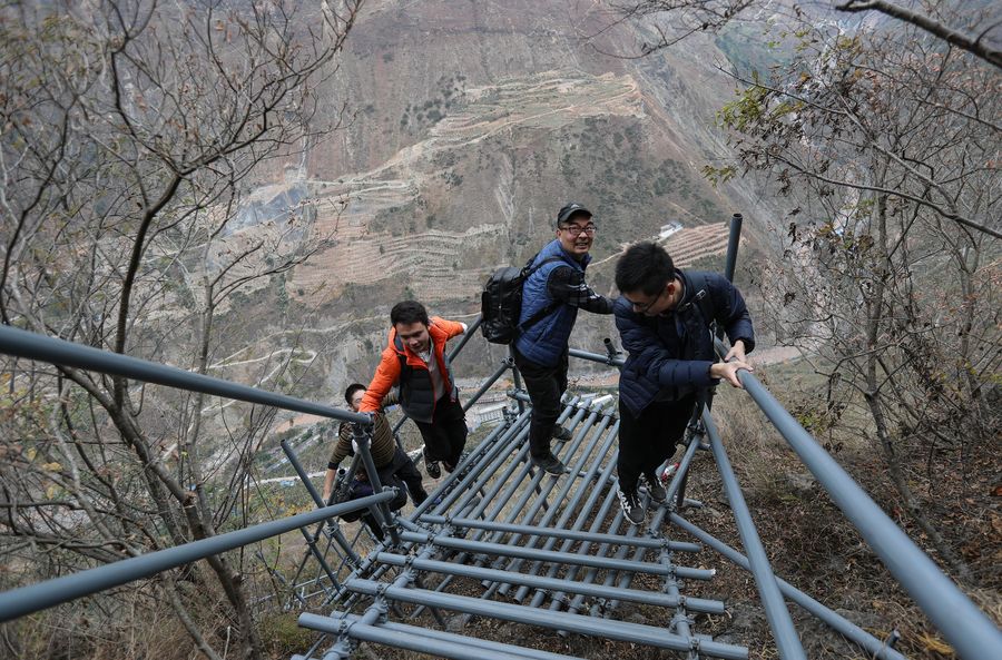 Tourists climb a steel ladder built along the cliff in Atulie'er Village, Zhaojue County, Nov. 23, 2019. (Xinhua/Jiang Hongjing)