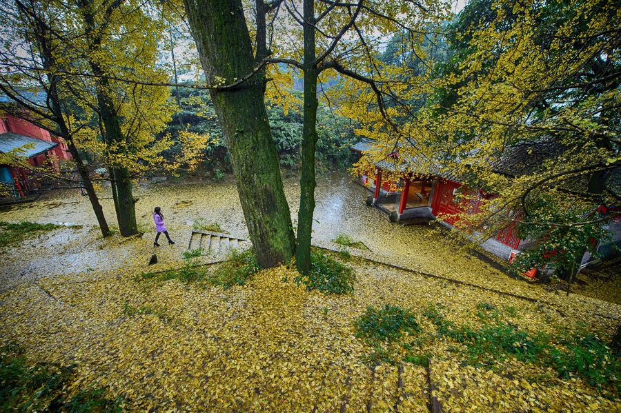 A woman walks under ginkgo trees at Tiangai Temple of Mengding Mountain scenic zone in Ya'an City, southwest China's Sichuan Province. (File Photo)