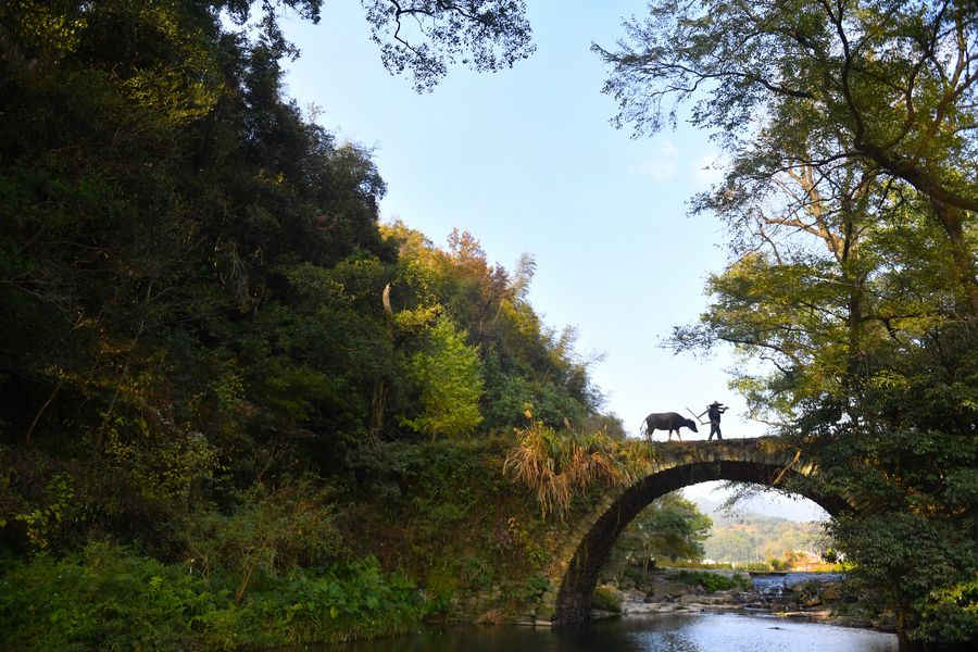 Villager Zhan Youshe leads his buffalo across a bridge for tourists to take photos in Yantian Village of Wuyuan County, east China's Jiangxi Province, Nov. 5, 2019. (Xinhua/Hu Chenhuan)