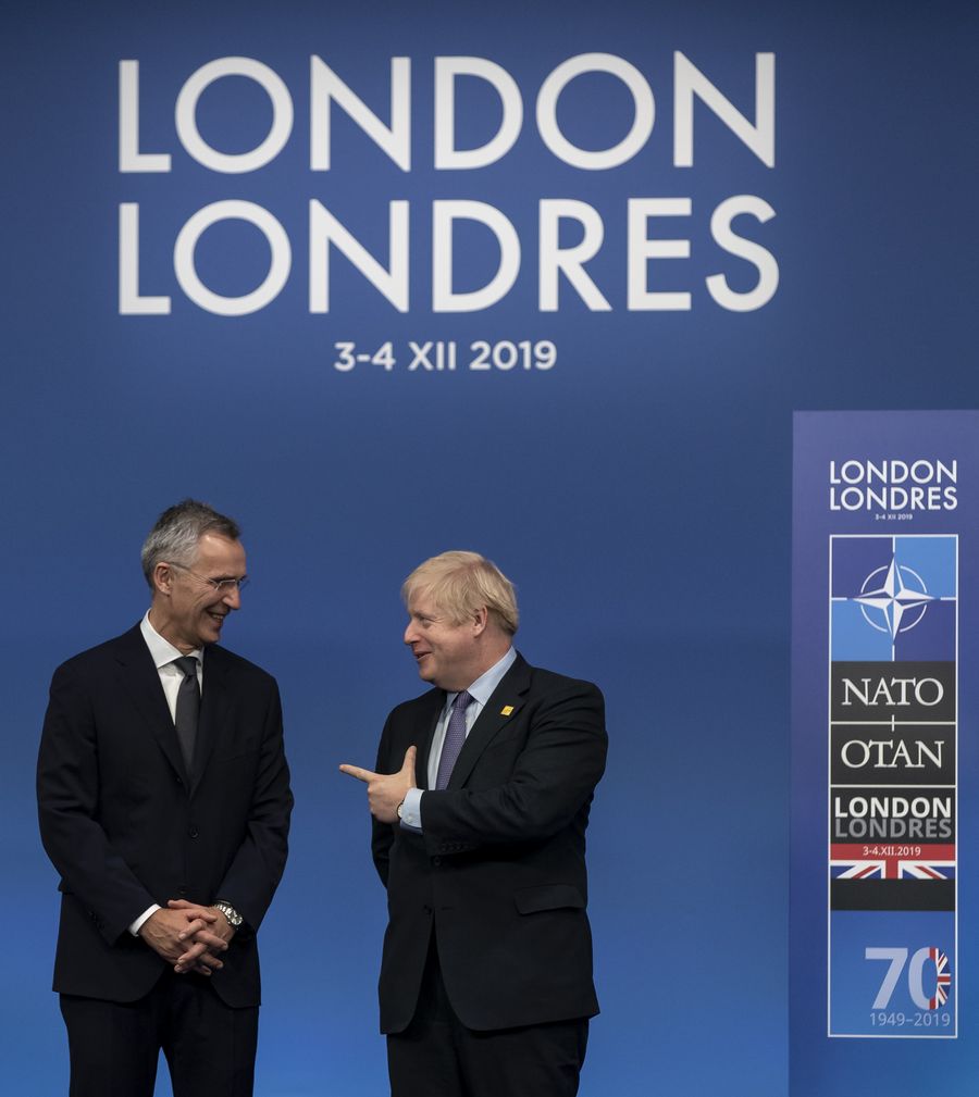 NATO Secretary General Jens Stoltenberg (L) talks with British Prime Minister Boris Johnson during the official handshake ceremony at NATO (North Atlantic Treaty Organisation) Summit in London, Britain on Dec. 4, 2019. (Xinhua/Han Yan)
