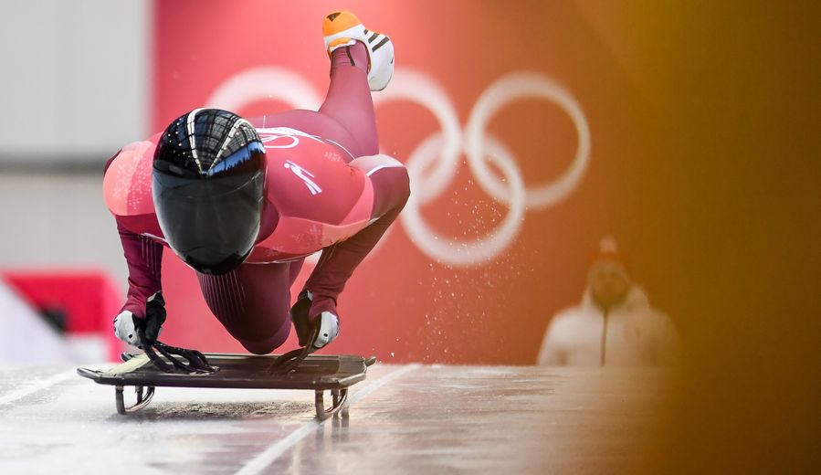 Olympic athelete from Russia Nikita Tregubov competes in the men's skeleton at 2018 PyeongChang Winter Olympic Games at Olympic Sliding Centre, PyeongChang, South Korea, Feb. 15, 2018. (Xinhua/Wang Haofei)