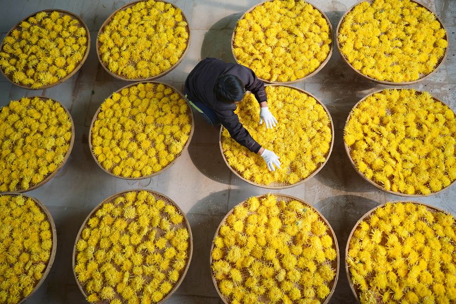 A worker puts chrysanthemum flowers into containers for baking at an agriculture ecological garden in Wuzhong Village of Qiaoxi District, Xingtai, north China's Hebei Province, Nov. 17, 2019. (Xinhua/Zhu Xudong)