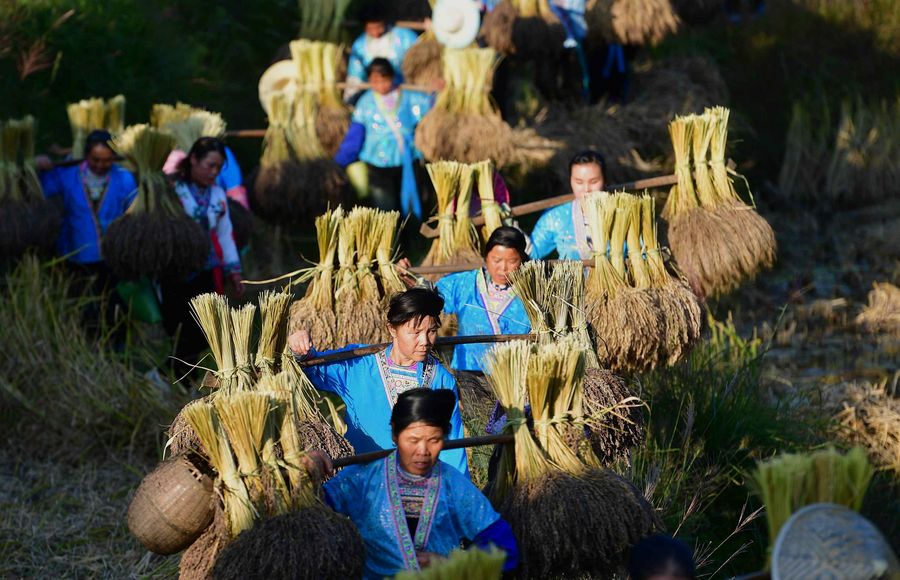Farmers of the Miao ethnic group carry bales of purple glutinous rice at Yuanbao Village in Antai Township in Rongshui Miao Autonomous County, south China's Guangxi Zhuang Autonomous Region, Oct. 30, 2018. Farmers are busy harvesting purple glutinous rice in Antai, where a production mode that incorporates cooperatives, planting bases and individual farmers has helped the locals out of poverty. (Xinhua/Huang Xiaobang)