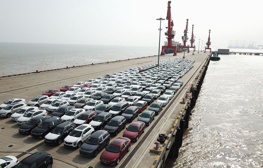 Aerial photo taken on June 27, 2019 shows new cars wating for shipment at a port in the Lingang area in Shanghai, east China. (Xinhua/Fang Zhe)