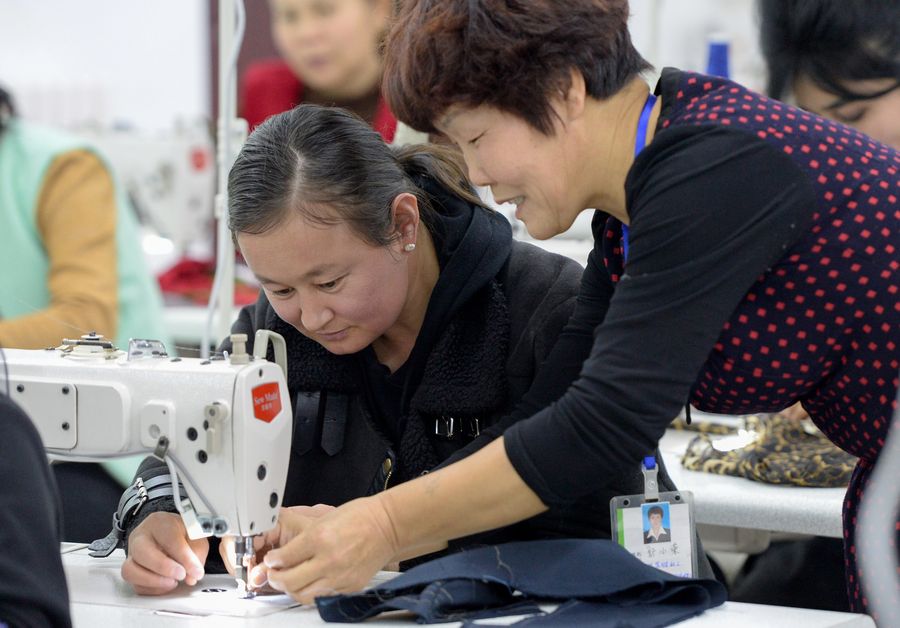A teacher instructs as a student sews during a vocational training class in Zhaosu County, northwest China's Xinjiang Uygur Autonomous Region, Dec. 14, 2019. (Xinhua/Ding Lei)