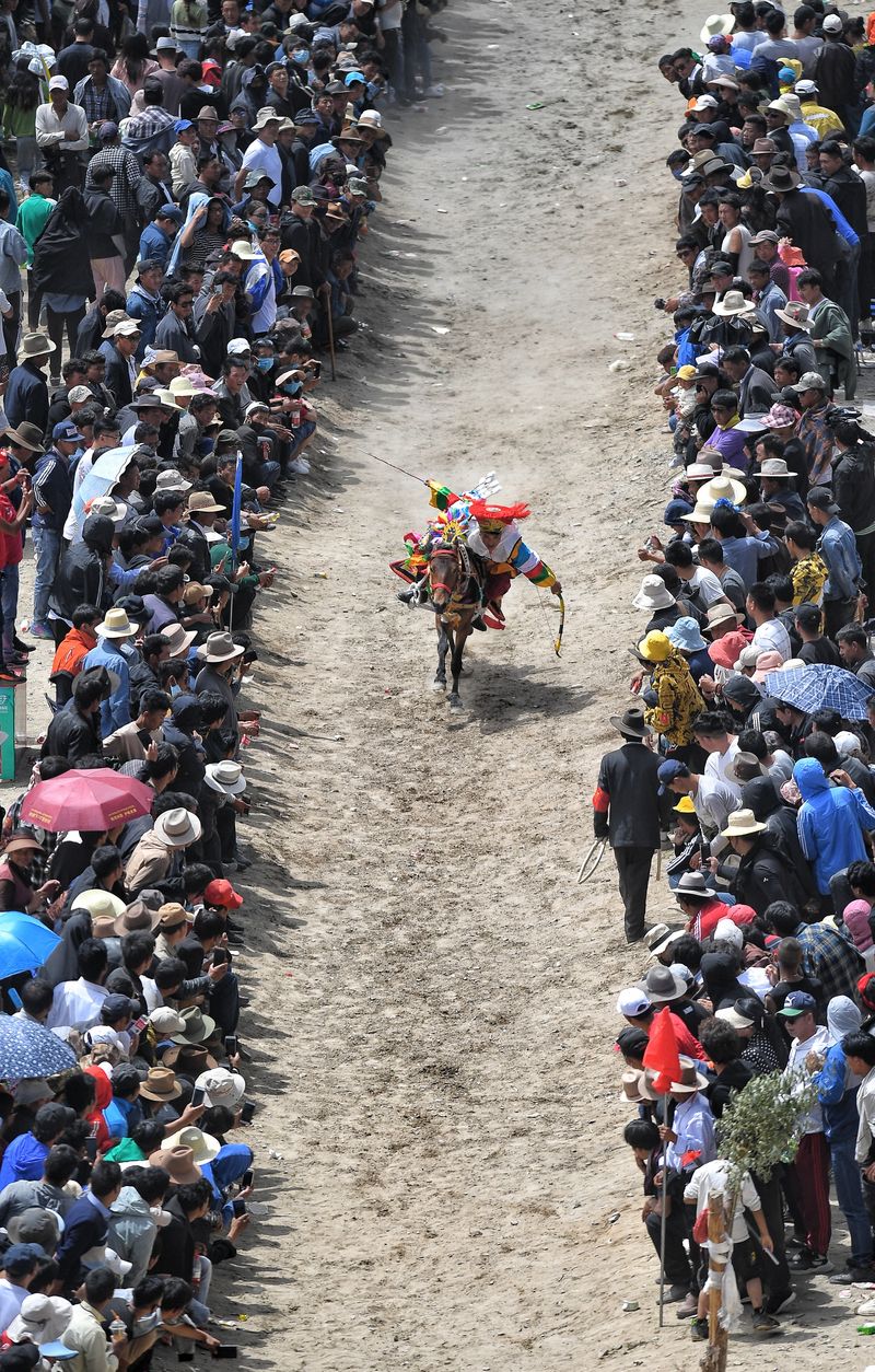 A man performs during a traditional horse racing in Lhunzhub County, southwest China's Tibet Autonomous Region, July 30, 2019. (Xinhua/Purbu Zhaxi)