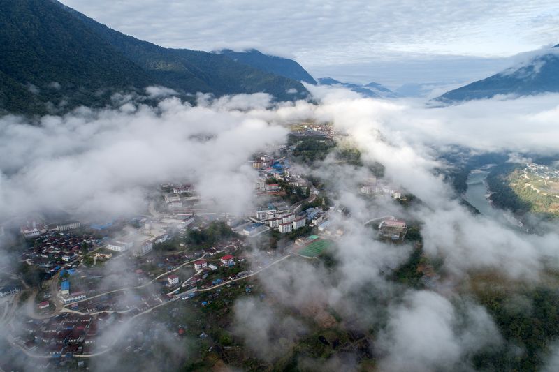 Aerial photo taken on April 9, 2019 shows fog floating above Medog County, southwest China's Tibet Autonomous Region. (Xinhua/Li Xin)