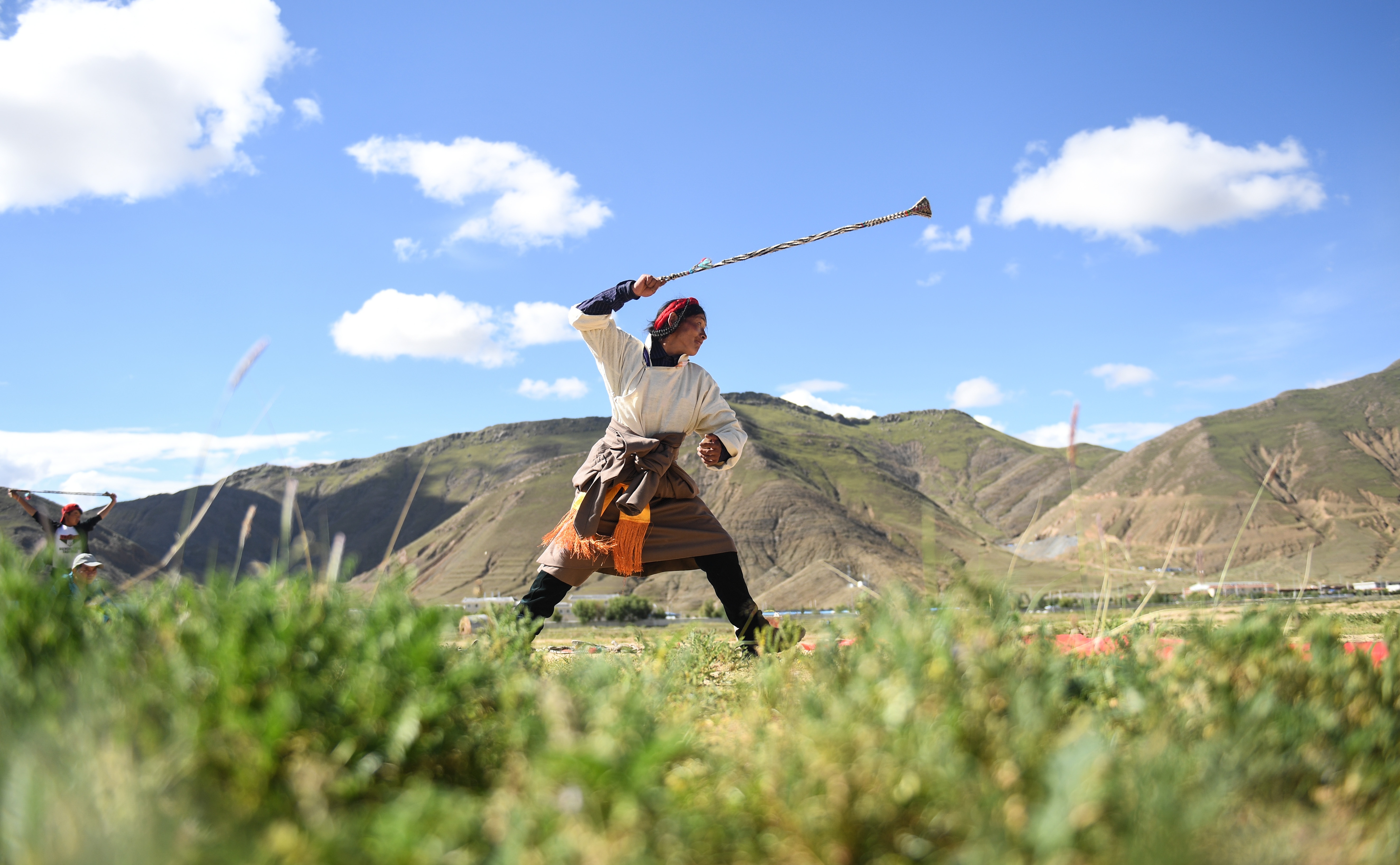 A player attends a traditional stone throwing competition in Xigaze, southwest China's Tibet Autonomous Region, Aug. 31, 2019. (Xinhua/Jigme Dorje)