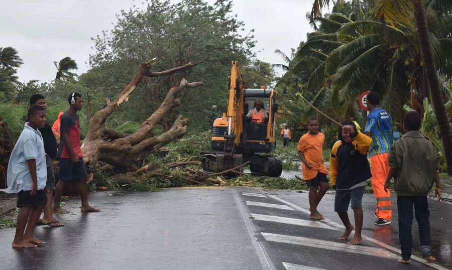 Workers clear fallen trees in Labasa on Vanua Levu, Fiji's second largest island, Dec. 28, 2019.(FIJI SUN/Handout via Xinhua)