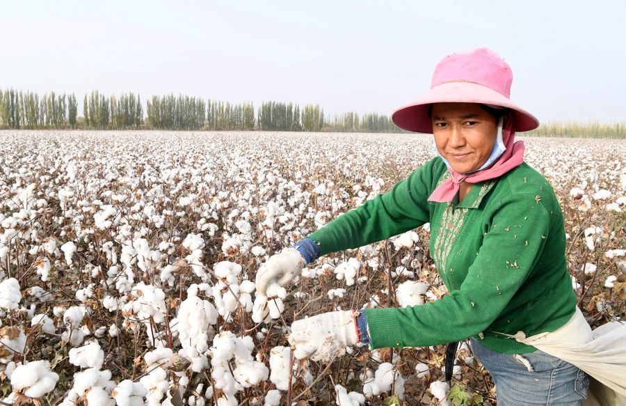 A woman works in a cotton field in Awat County, northwest China's Xinjiang Uygur Autonomous Region, Oct. 25, 2019. With a long history of cotton planting, Awat is known as the "Town of Cotton" in China. (Xinhua/Sadat)