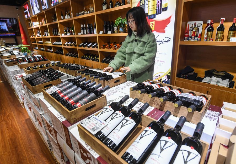 A staff of a liquor import company displays the newly-arrived red wine from Serbia at the Yiwu China imported commodities mall in Yiwu City, east China's Zhejiang Province, Dec. 20, 2019. (Xinhua/Xu Yu)
