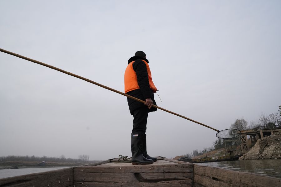 HEFEI, Jan. 9 (Xinhua) -- Zhu Changhong, an ex-fisherman on the Yangtze River, skillfully scooped up a plastic bottle with a net from his boat while patrolling the water on a cold afternoon in early January.