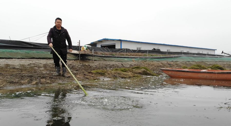 Ex-fisherman Zheng Laigen works at his fishing farm in Maanshan, east China's Anhui Province, on Jan. 8, 2020. TO GO WITH XINHUA HEADLINES OF JAN. 9, 2020. (Xinhua/Qu Yan)