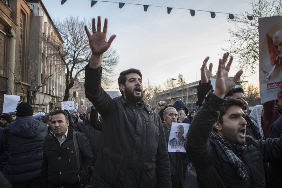A protestor holds a picture of Iranian commander Qasem Soleimani during a protest outside the British embassy in Tehran, Iran, Jan. 12, 2020. (Xinhua/Ahmad Halabisaz)