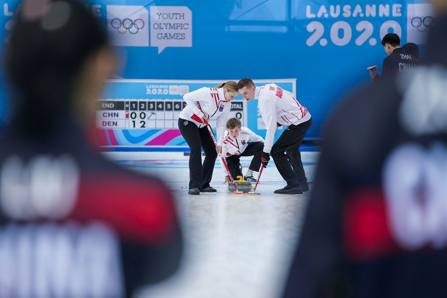 Jonathan Vilandt (C), Natalie Wiksten (L) and Kilian Thune of Denmark compete during the mixed team group B session 15 of curling between China and Denmark at the 3rd Winter Youth Olympic Games at Champery Curling Arena, Switzerland on Jan. 14, 2020. (Xinhua/Bai Xueqi)