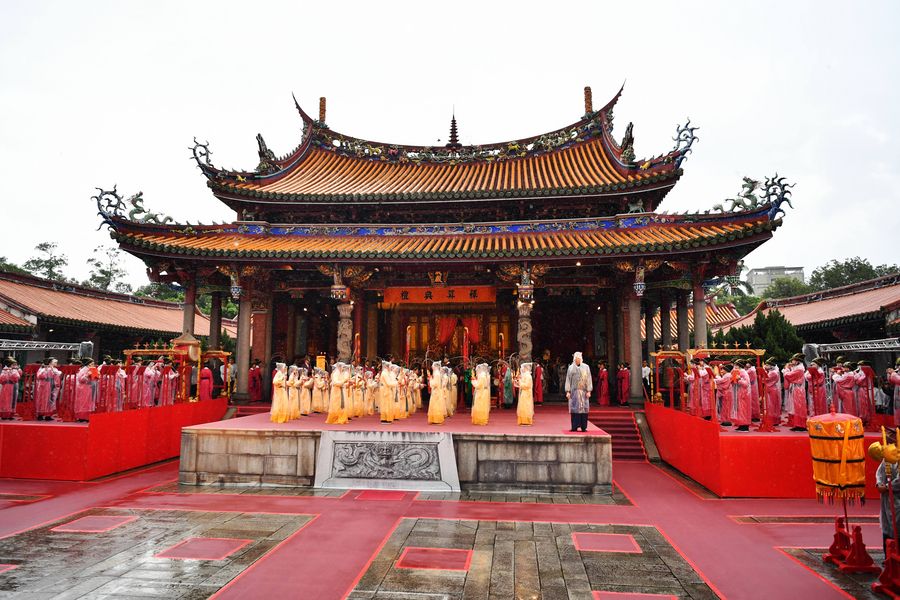 A ceremony is held to mark the 2,570th anniversary of the birth of ancient Chinese sage and educator Confucius at the Confucius Temple in Taipei, southeast China's Taiwan, Sept. 28, 2019. Confucius (551-479 B.C.), an educator and philosopher, founded Confucianism, a school of thought that deeply influenced later generations. (Xinhua/Chen Bin)