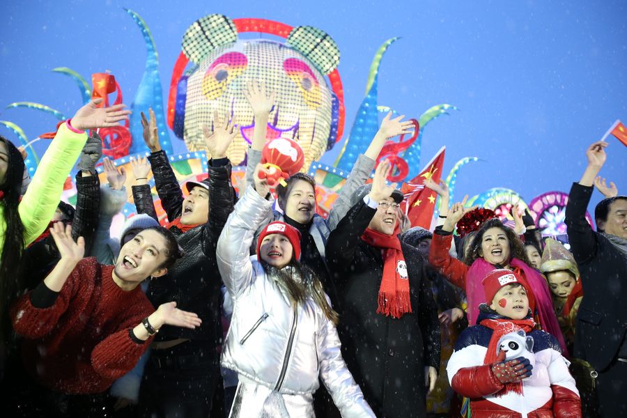 In heavy snow fall, Huang Ping, the Chinese consul general in New York, stood in the front of the cheering crowd, holding the hands of Bing Dwen Dwen, the mascot of the Beijing Winter Olympics, and Shuey Rhon Rhon, the mascot of the Beijing Winter Paralympics.