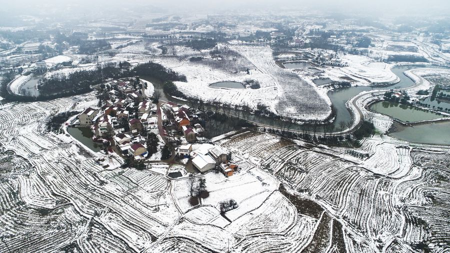 Aerial photo taken on Jan. 27, 2020 shows the scenery of the snow covered Shucheng County in east China's Anhui Province. (Xinhua/Tao Ming)