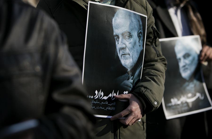 People take part in a protest in front of Iranian Foreign Ministry in Tehran, Iran, on Jan. 27, 2020. A group of people gathered in front of Iranian Foreign Ministry on Monday to announce their opposition to any "possible" talks with the United States over the thorny issues, Iranian Student News Agency (ISNA) reported. (Photo by Ahmad Halabisaz/Xinhua)
