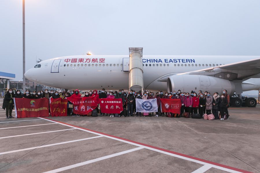 The second batch of medical workers pose for a group photo before their departure to Wuhan of Hubei Province, at Hongqiao International Airport in east China's Shanghai on Jan. 28, 2020. (Xinhua/Wang Xiang)