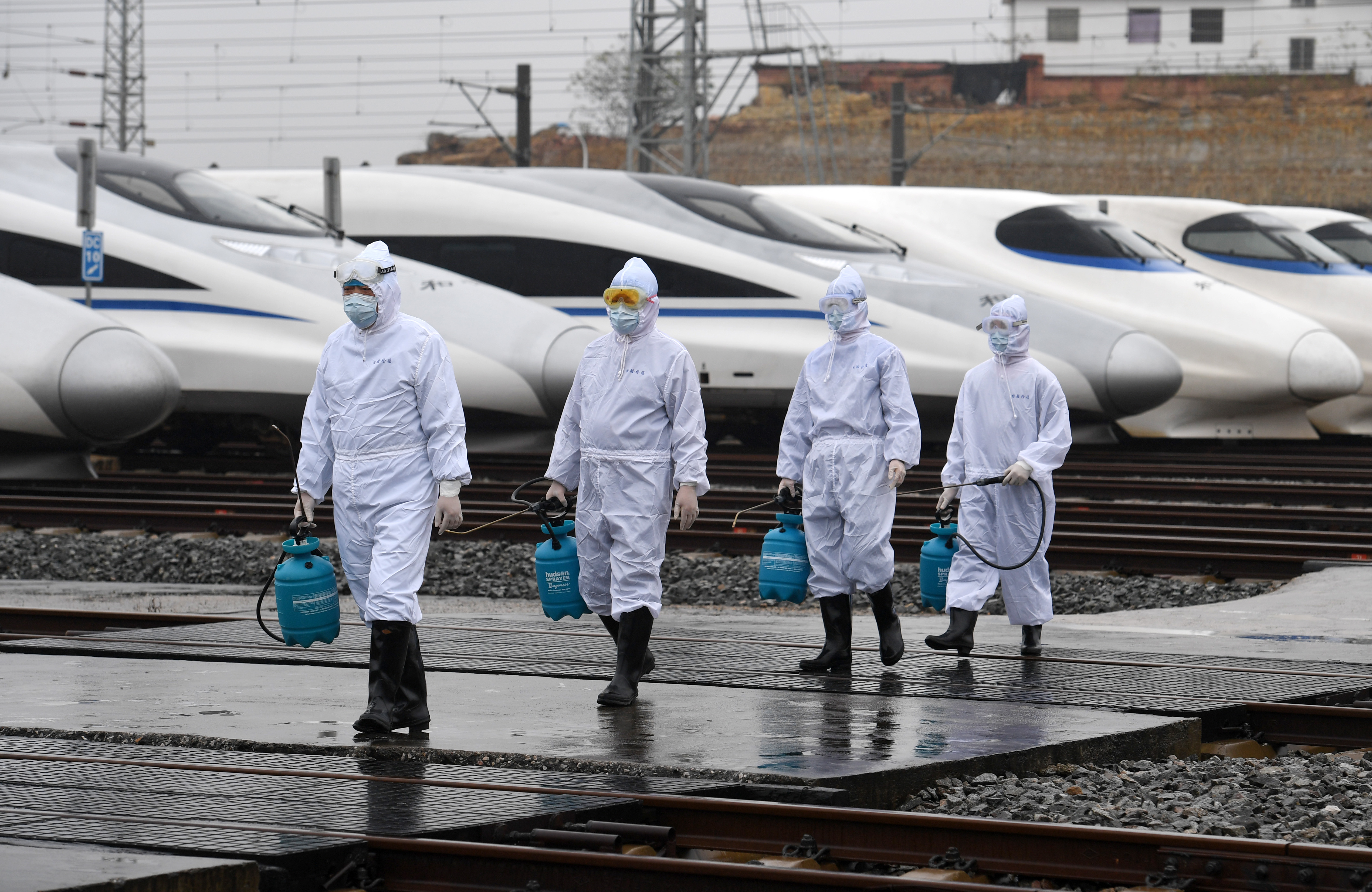 Staff members of China Railway Nanning Group Co., Ltd. walk out of bullet trains after disinfection work in Nanning, south China's Guangxi Zhuang Autonomous Region, Feb. 6, 2020. (Xinhua/Lu Boan)