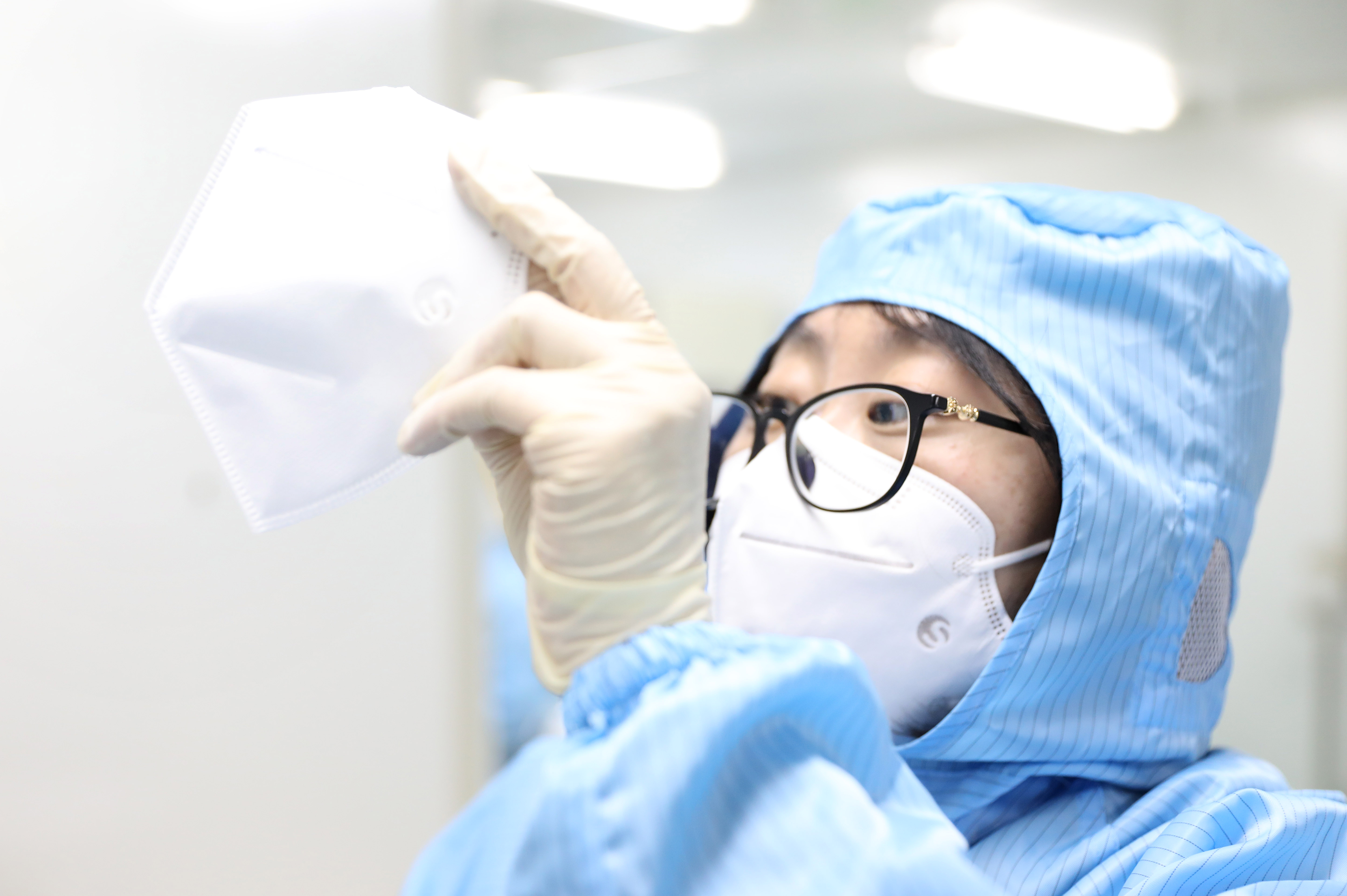 A worker checks the quality of medical N95 masks at a workshop of a mask production company in Shenyang, capital of northeast China's Liaoning Province, Feb. 8, 2020. (Xinhua/Yao Jianfeng)